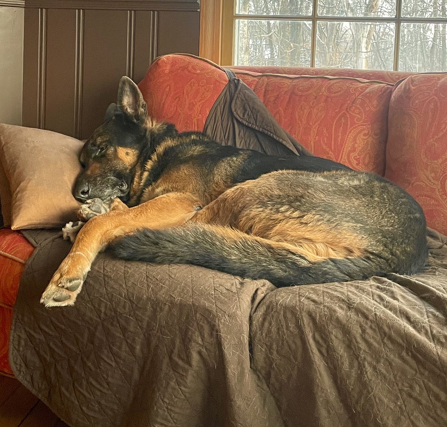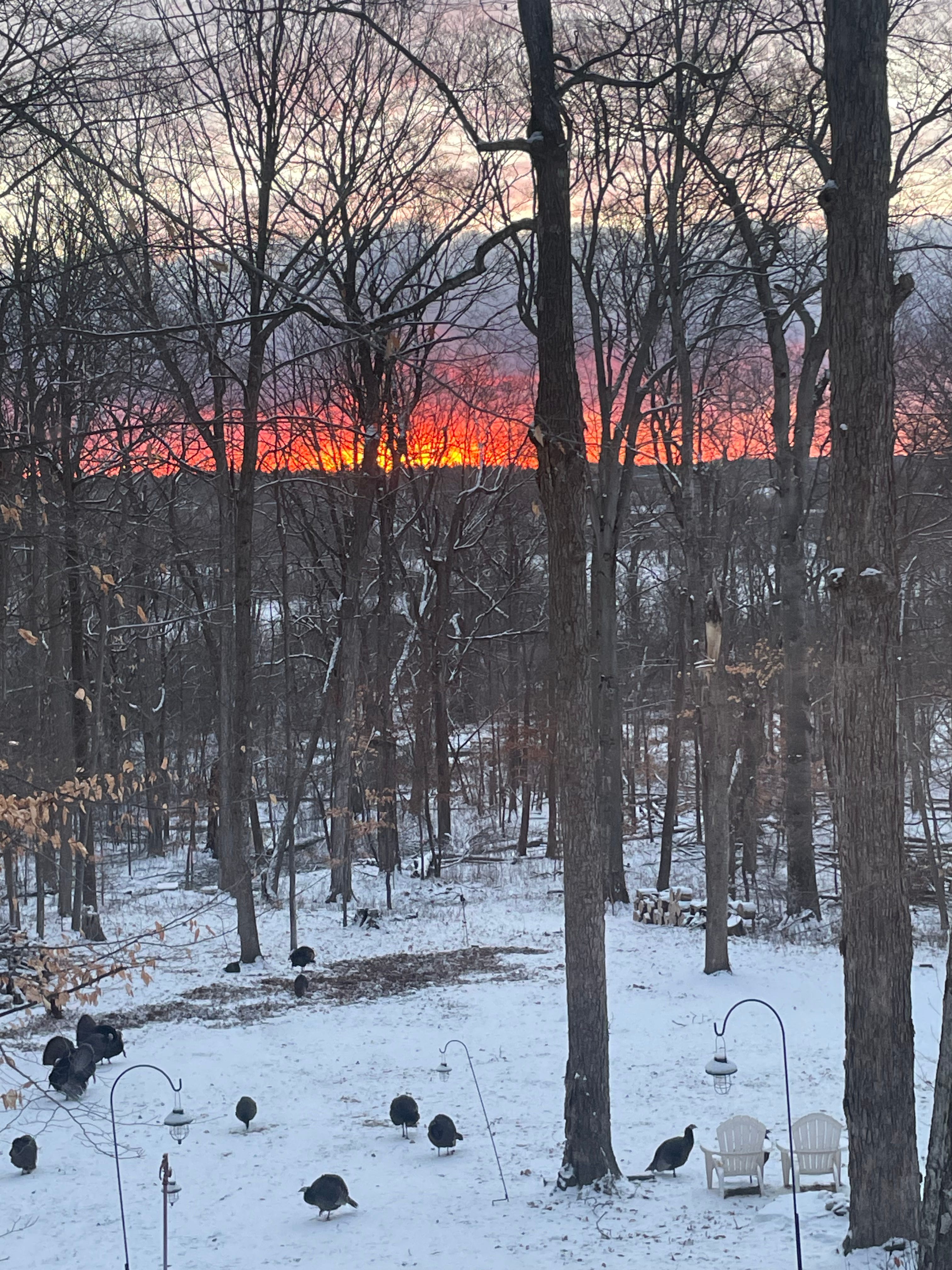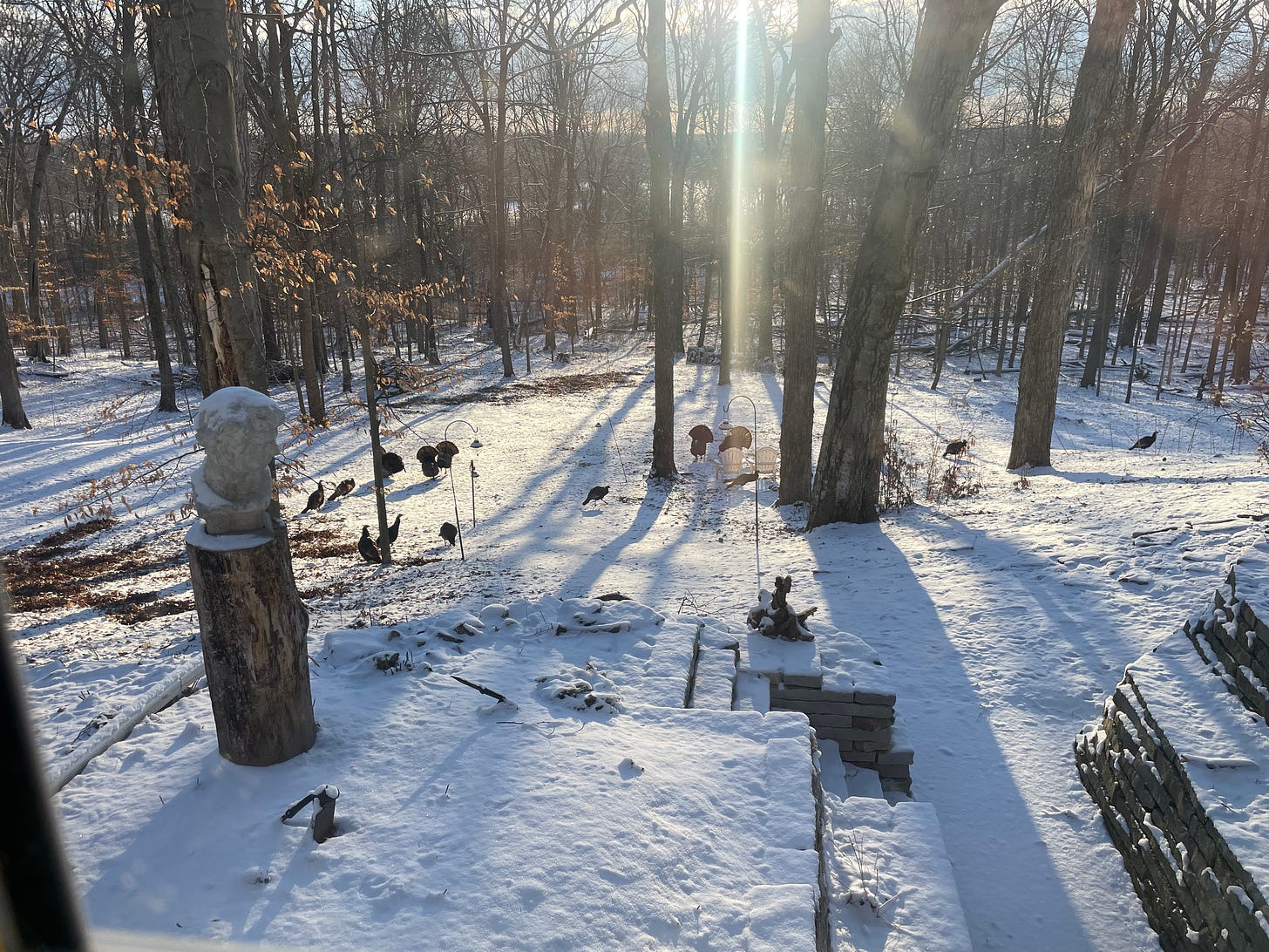 Down the hill, the turkeys are pivoting in their display of feathers like spinning automatons. They seem to have gotten the idea that spring is coming, and the males’ coloring is beginning to take on a familiar lurid quality, more like lizards than birds. Here by the fire, the dogs are sleeping peacefully after another night of coyote hazing. I was tempted at one point to record their dual howling, which is new—Eli never used to howl—and beautiful, if not restful.