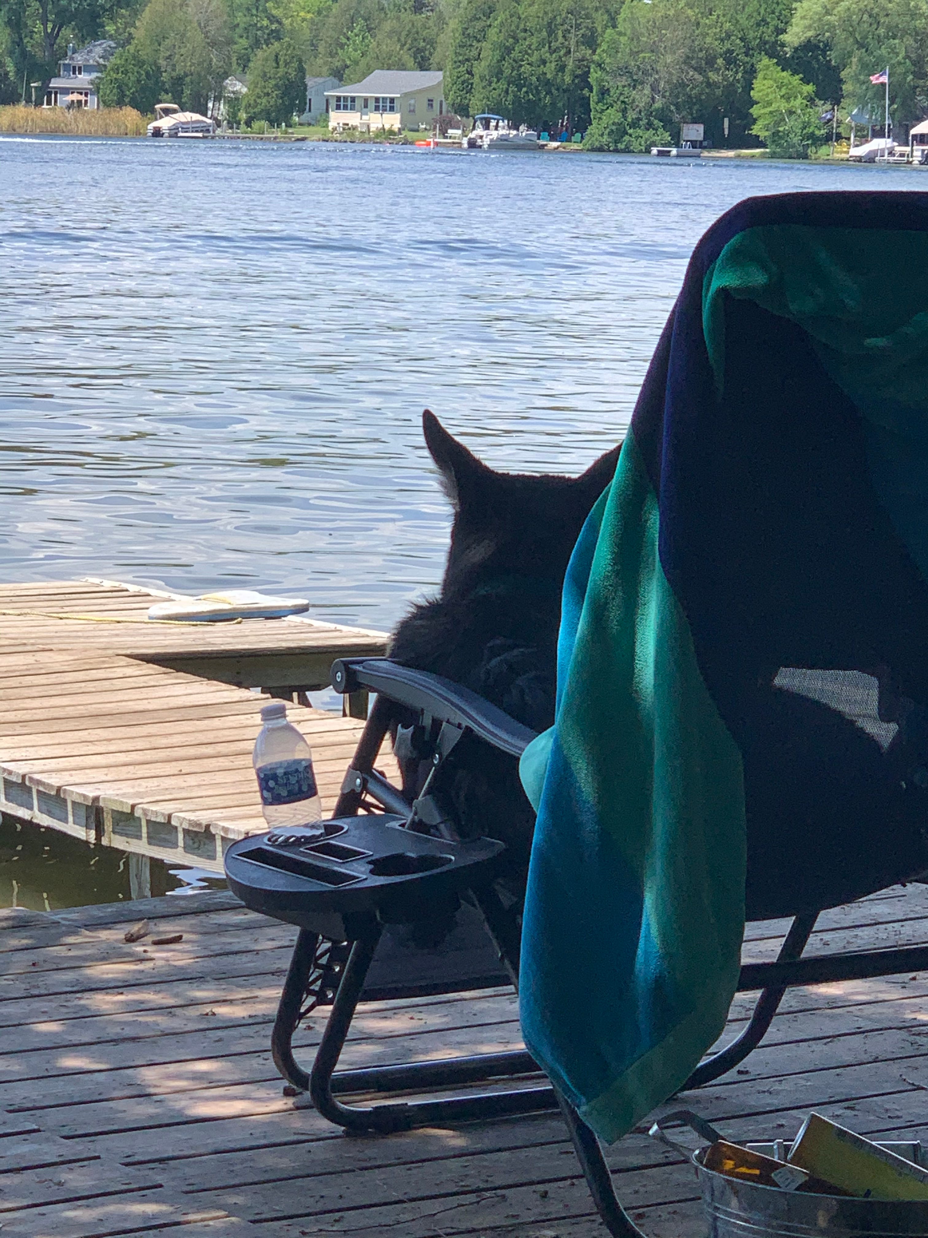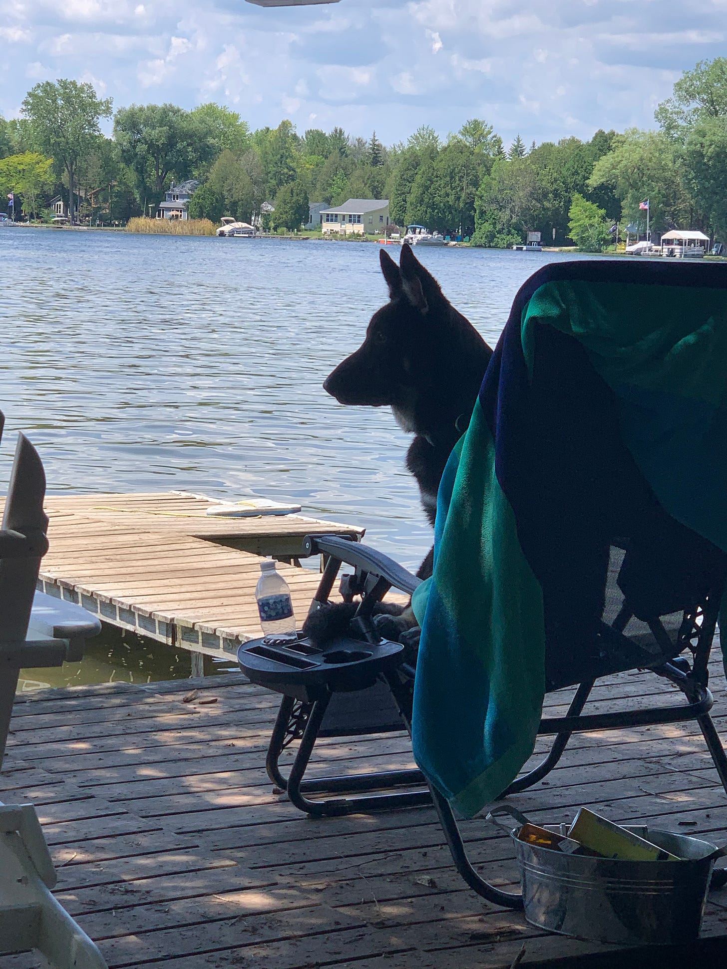 I used to be a big fireworks person, but this year, I spent the show watching a lone duck swimming confusedly in circles, and it broke my heart to think of all the creatures who might be startled or frightened. Our own dogs are at home with a dog sitter who builds them tents to hide in, plays music, and generally distracts them from the noise. Even yesterday afternoon and evening the amateur fireworks continued sporadically. The bangs are far worse at the lake than at home because they are so close, and the water carries the sound. We miss the dogs terribly, and are heading home early this morning to see them. At the community parade on the Fourth, I felt a spasm of longing for Moses, who loved the parade and the guns and the sirens and the fireworks. He came with us every year, moving through the crowds with magnificent dignity, people unconsciously reaching out their hands to touch him as he passed.